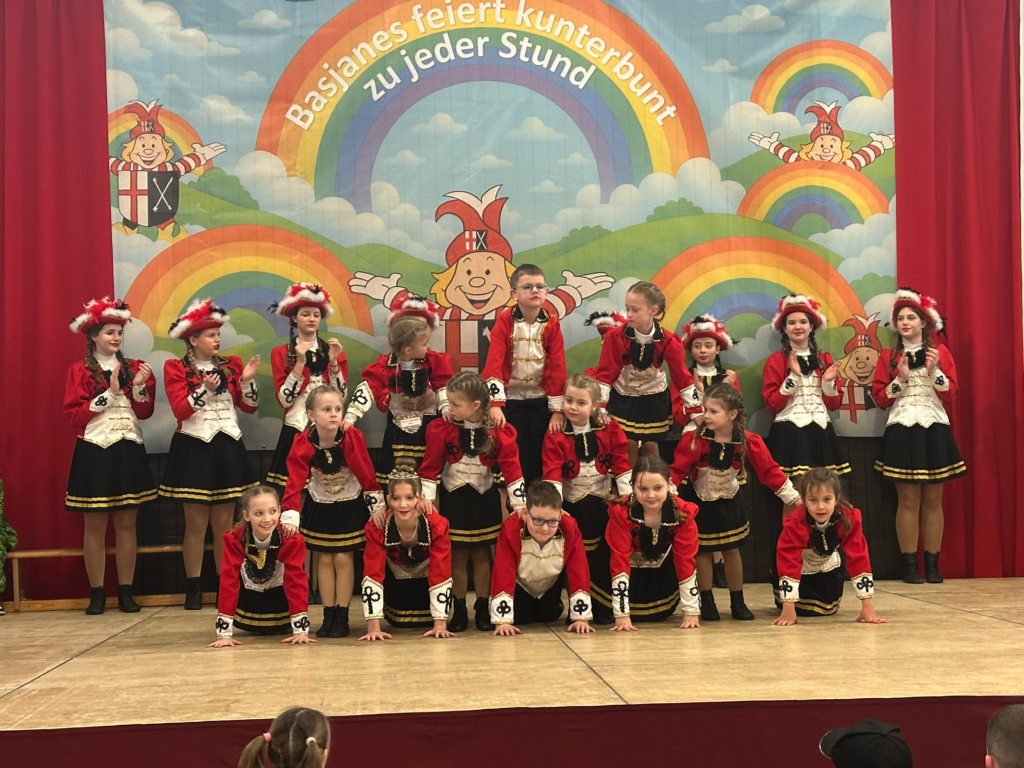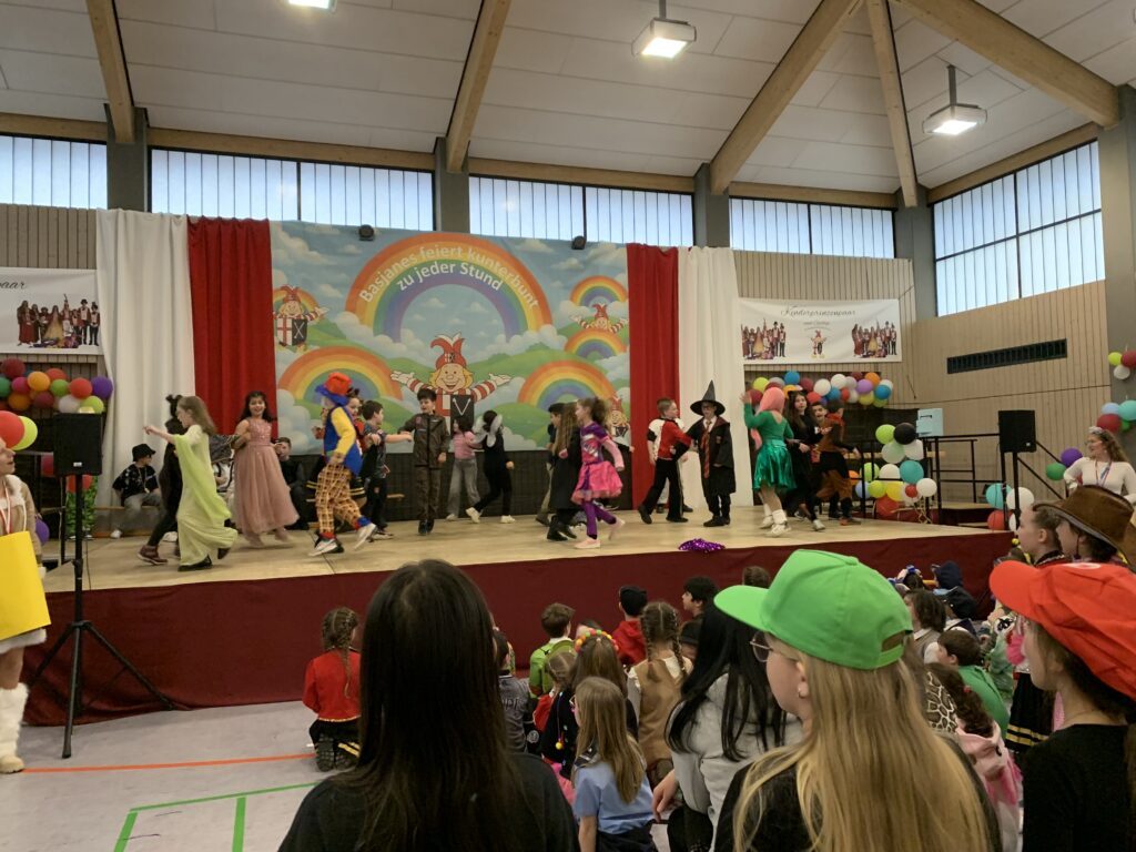 Wir feieren Karneval mit der ganzen Schule und dem Kinderprinzenpaar Prinzessin Jonna und Prinz Ben und ihrem gesamten Hofstaat! Der Karnevalsverein Basjanes Helau und die Möhnen sind dabei. Viele Eltern schauen zu – was für eine tolle Stimmung!